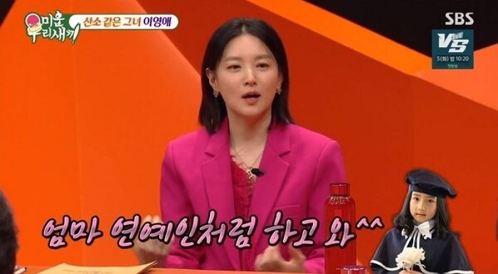 SBS ‘미운 우리 새끼’에 출연한 이영애는 딸과의 솔직한 대화를 공개했어요. “엄마 그러고 학교 갈 거야?”, “연예인처럼 하고 와줘!”라는 말들에서, 사춘기 딸의 귀여운 반응과 엄마에 대한 자부심이 묻어나와 보는 이들의 미소를 자아냈죠.